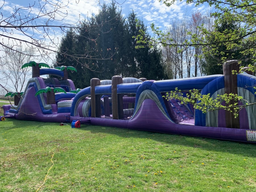 Looking to add excitement to your next event? We've got you covered! Experience the Purple Crush Paradise 70-foot obstacle course with dual lane 18-foot slide wet or dry in Grove City, Hermitage, Butler, Slippery Rock, Meadville, New Castle, Kittanning, Pittsburgh. Our delivery and setup ensure a hassle-free experience, allowing you to focus on enjoying the fun. 🚚