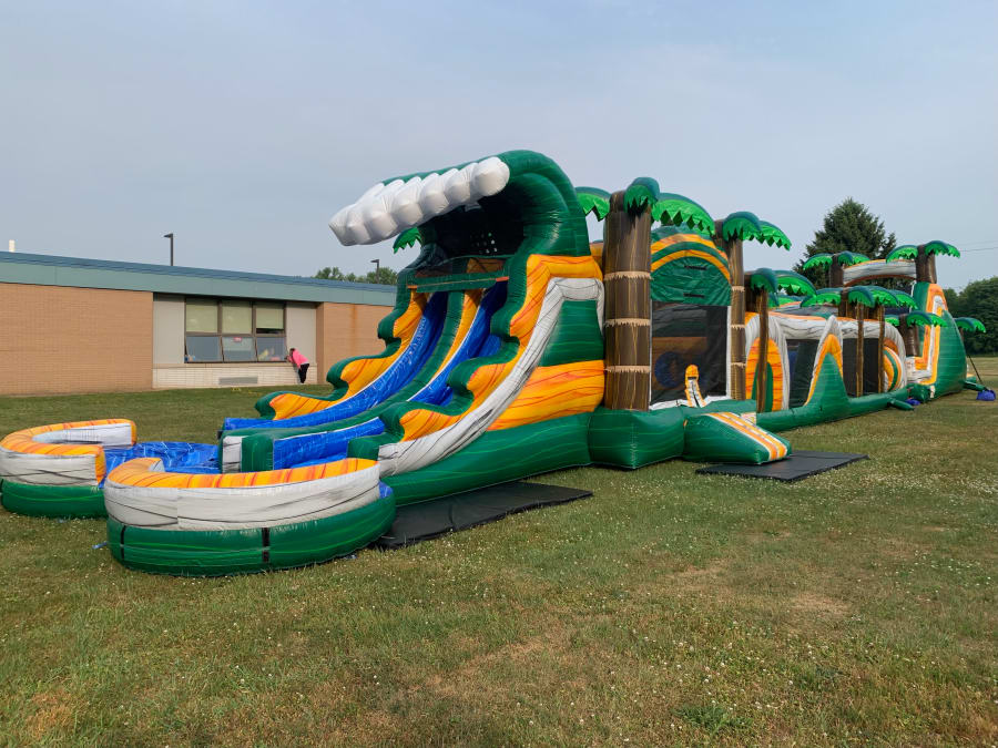 Whether you're hosting a birthday party, corporate event, or community festival, the Tropical Adventure 110 Colossal obstacle course with 4 slides and a 18 foot wide mouth slide in Grove City, Hermitage, Butler, Slippery Rock, Meadville, New Castle, Kittanning, Pittsburgh is the perfect addition to ensure a memorable day. Our team provides seamless delivery and setup in your area, making it easy to bring the thrill of the tropics to your backyard or event venue. 🏝️🏠