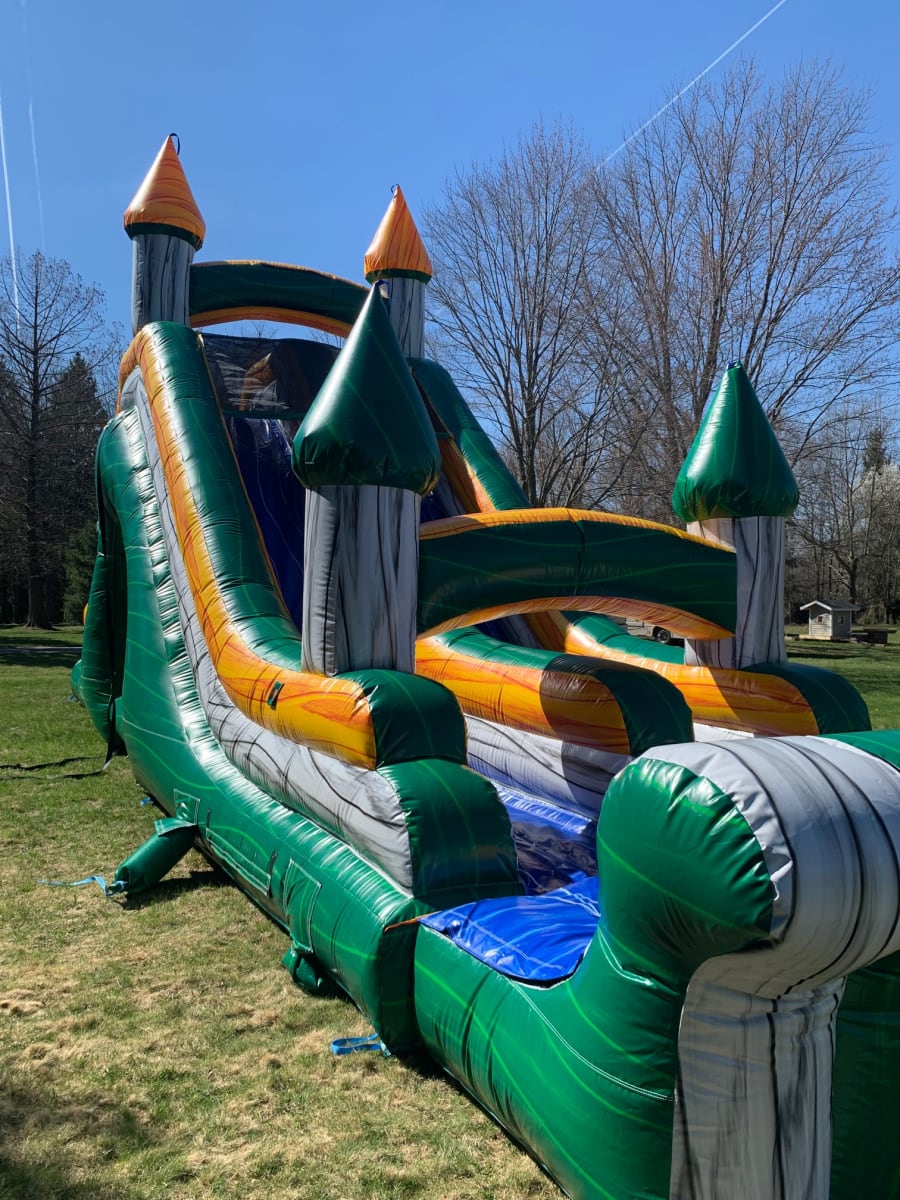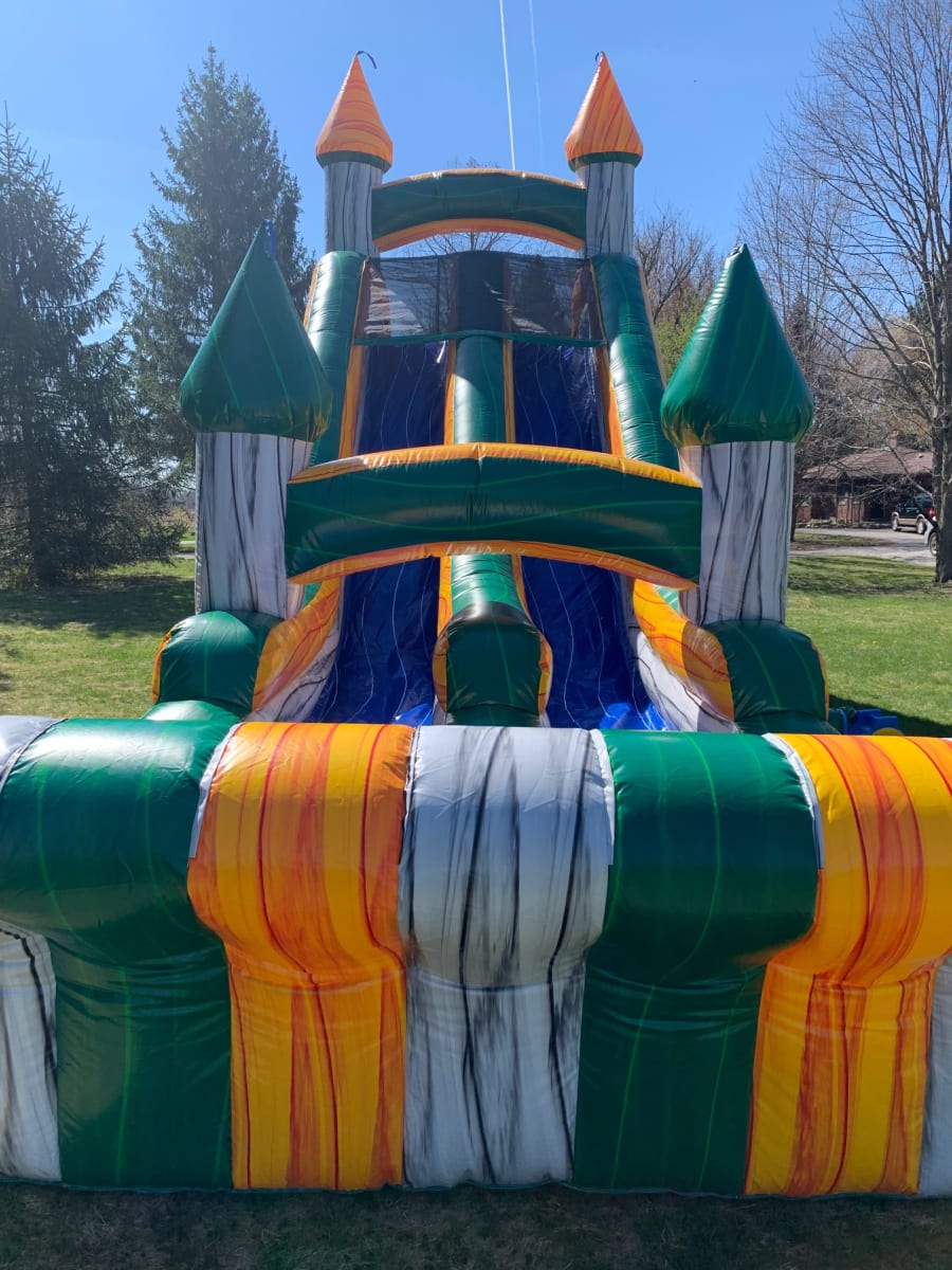 Our Tropical Castle slide with 22 foot dual lane plunge in Grove City, Hermitage, Butler, Slippery Rock, Meadville, New Castle, Kittanning, Pittsburgh is the ideal entertainment solution for gatherings in these locations. We are proud to offer delivery and setup, ensuring a hassle-free experience for you!