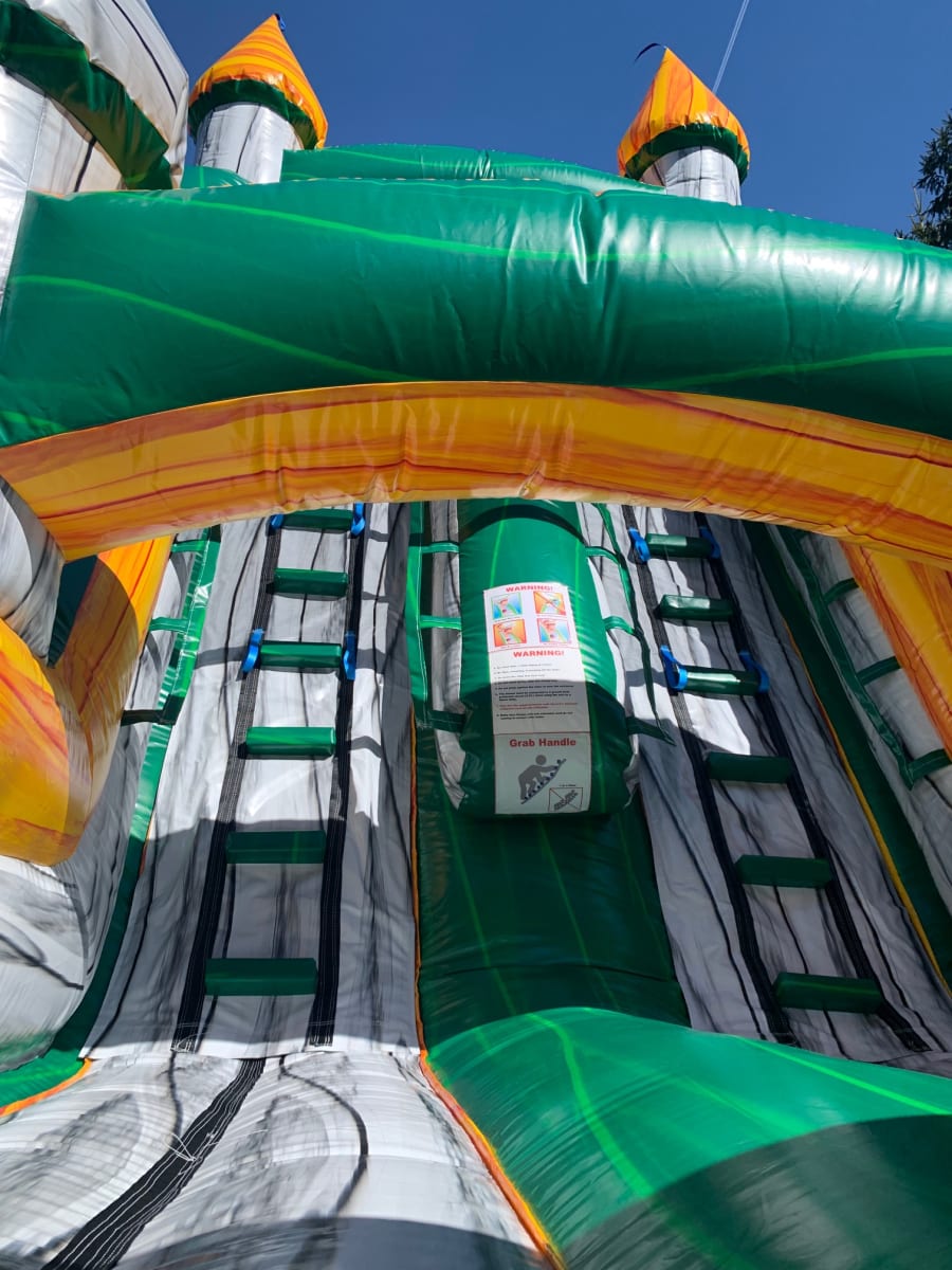 Get ready to elevate your party or event to the next level with our Tropical Castle Dual Plunge Slide - 22 Foot. This towering masterpiece is designed to deliver endless excitement and create unforgettable memories. Imagine the thrill as guests climb to the top of this majestic structure and zoom down the dual lanes, feeling the rush of wind in their hair. Whether you're hosting a birthday party, a community event, or a corporate gathering, this slide promises to be the centerpiece of fun. 🎉
